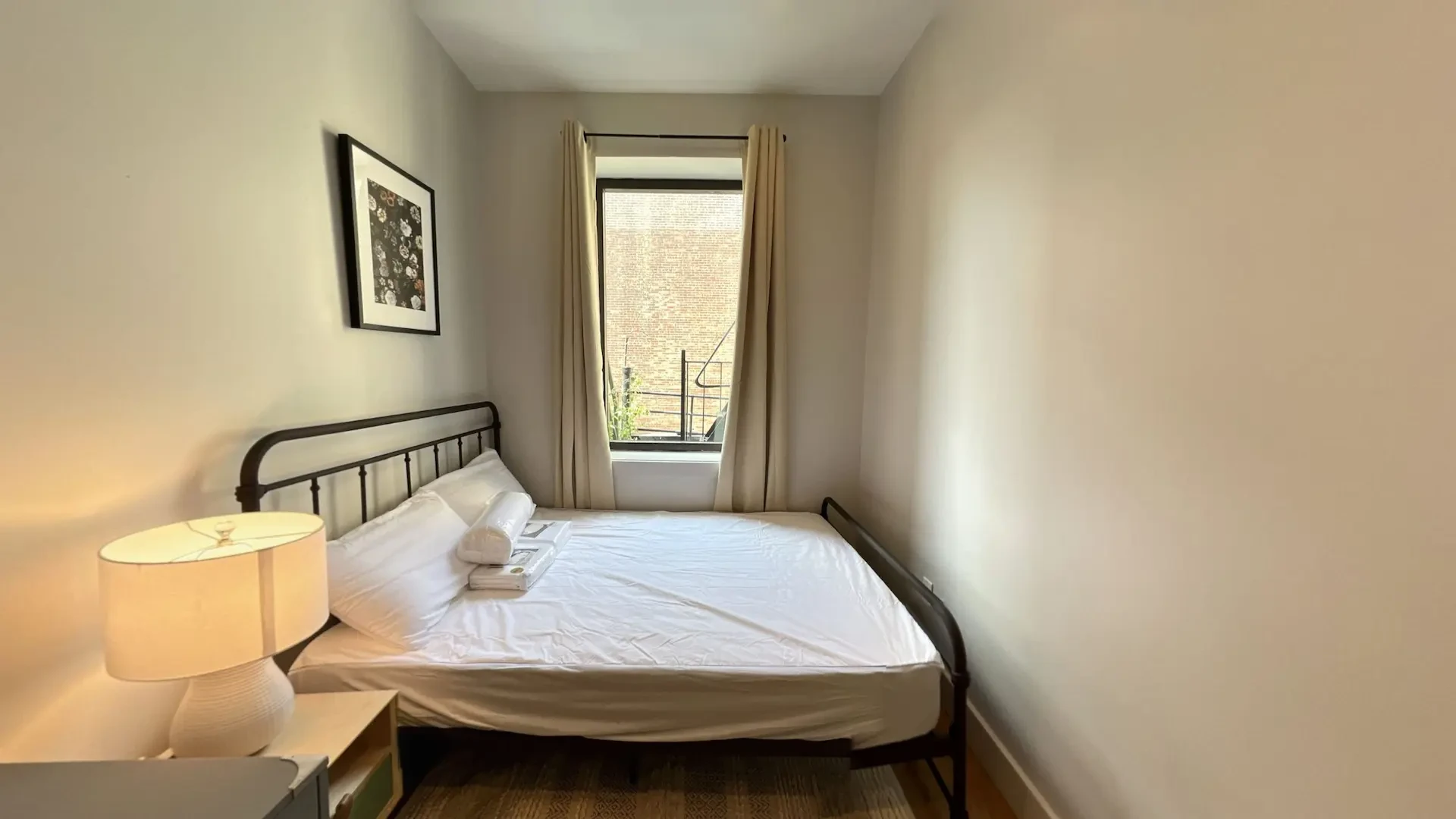 Bedrooms in this Central Harlem apartment can be furnished or unfurnished based on your individual needs. All three bedrooms offer windows for natural light and are large enough for a full-size bed, nightstand, and personal workspace or dresser. Two of the three bedrooms include closets for storage, while the third comes equipped with an armoire. The bathroom has been recently remodeled and boasts a luxurious soaking bathtub and shower combination, modern fixtures, a new single-sink vanity, and white subway tiling, all of which matches this apartment’s contemporary design. The eat-in kitchen features black slab cabinets, a new stainless steel sink with a pull-out faucet, a wall-mounted TV, and white quartz countertops. The new washer and dryer are located in the kitchen.