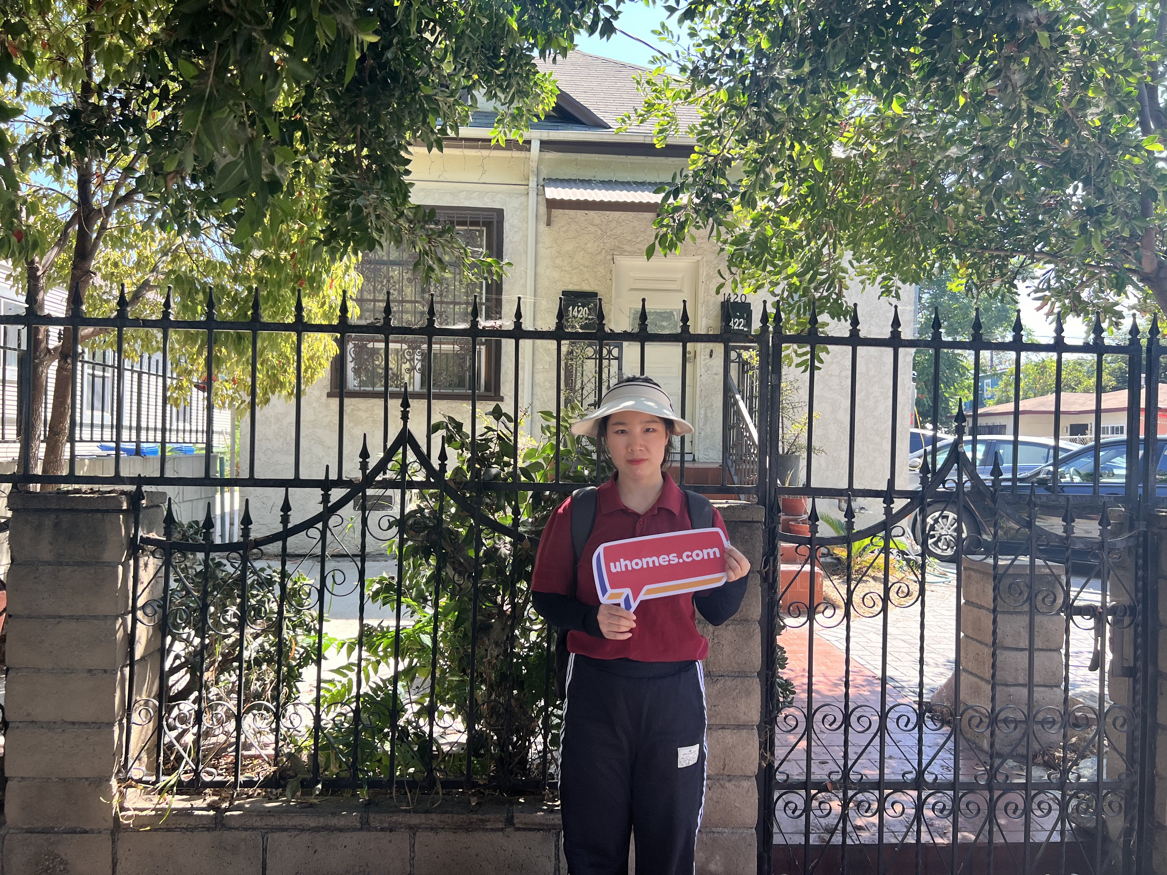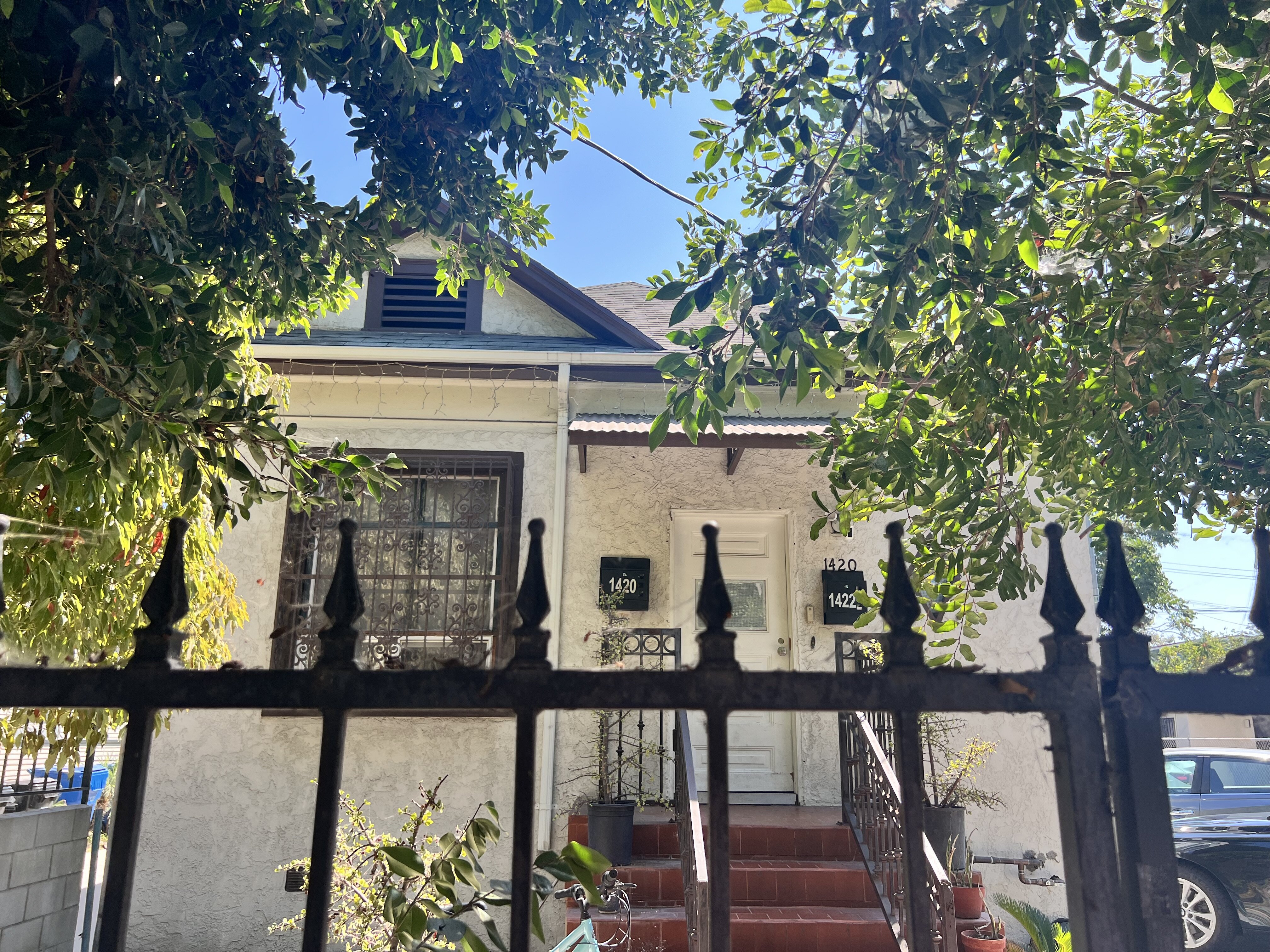 3) There is an iron fence in the front yard of the house.