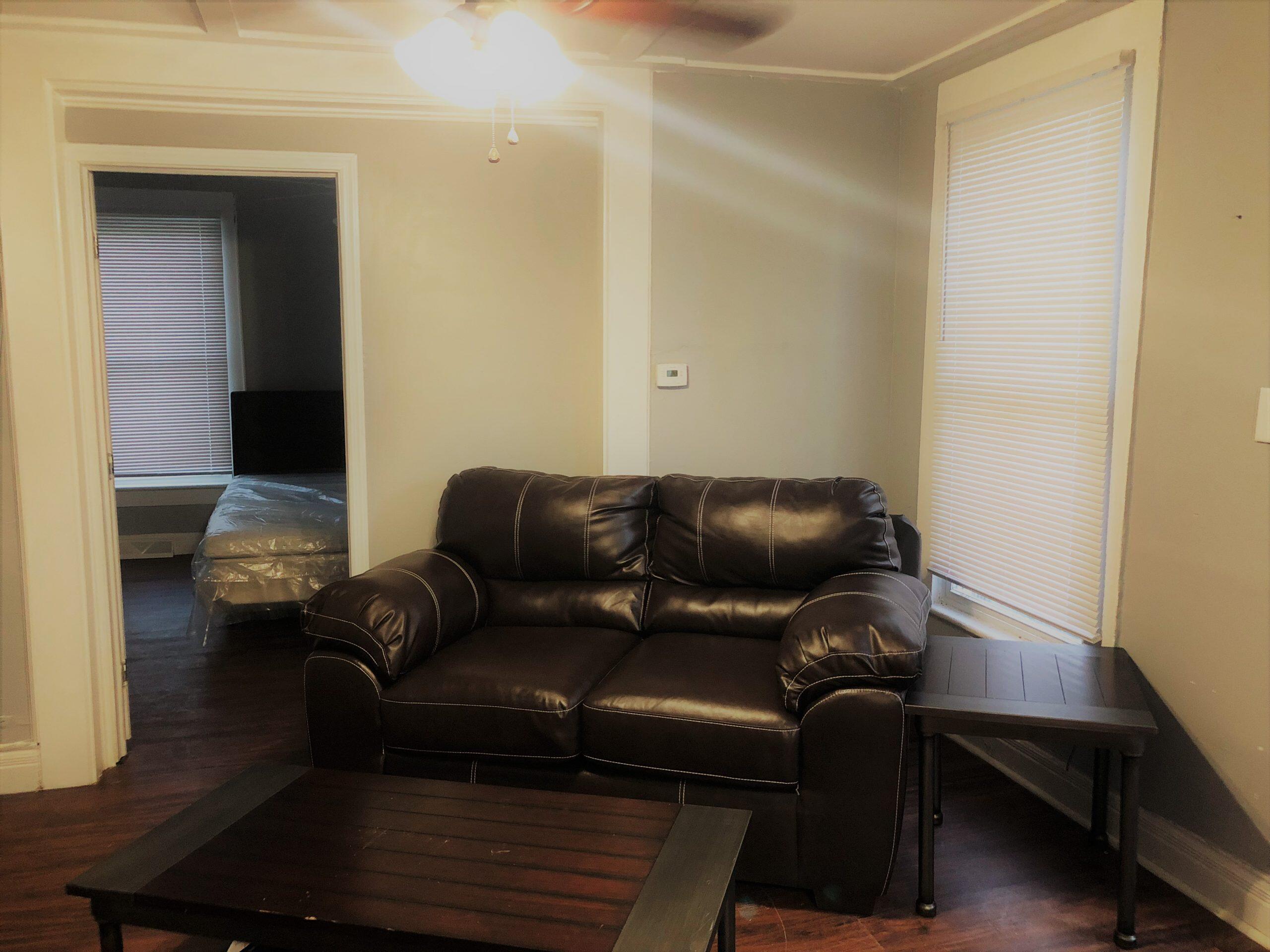 Living Room Furnished with Leather Sofa, modern coffee/end table.