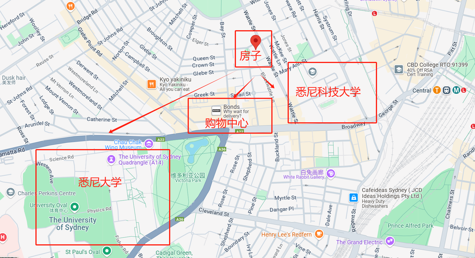 It’s a 10-minute walk to USYD, about 5 minutes to Broadway Shopping Center (which has various banks, large supermarkets, electronics stores, mobile phone shops, clothing stores, food courts, post office, travel agencies, cinemas, etc.), and approximately 8 minutes to UTS, and 15 minutes to Chinatown.