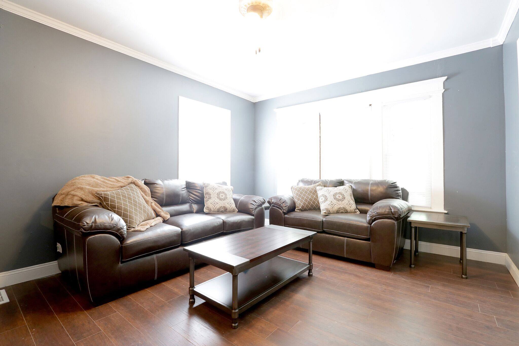 Living Room Furnished with Leather Sofa and Love Seat, Coffee Table and End Table.
