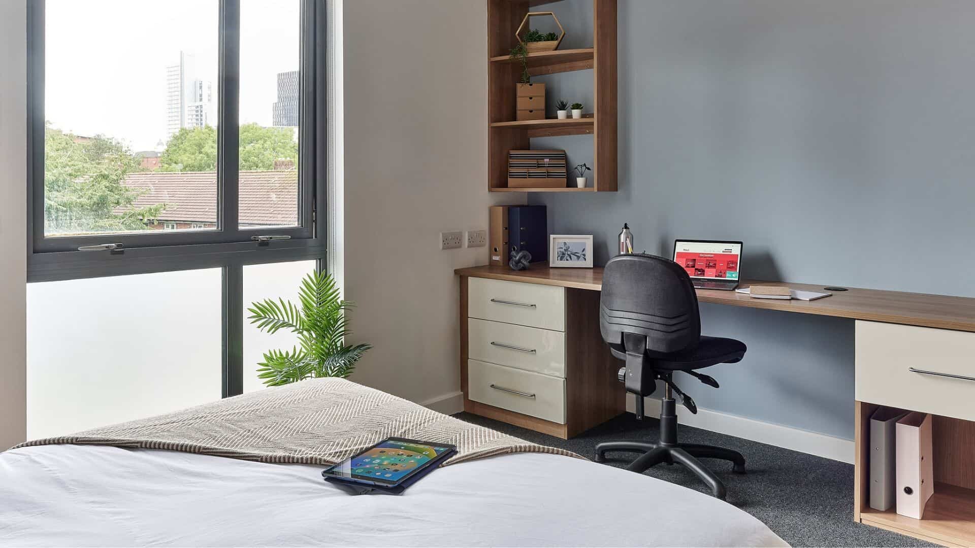 Cavendish Place Manchester offers a wide selection of thoughtfully designed room types, including modern en-suite rooms, self-contained studios, and private one-bedroom apartments. All rooms are equipped with a comfortable double bed, a desk and chair, a spacious wardrobe and drawers, an electric heater, and a bookshelf with a notice board. Additionally, bedside tables and under-bed storage cabinets provide extra storage space. The kitchen is fully equipped with an oven and stove, refrigerator, microwave, toaster, and kettle.