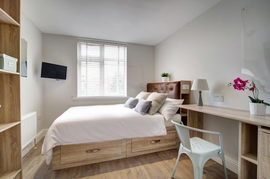 The 8 bedroom student flat at Park View, just a short distance away from the NTU campus has a huge amount of space for all 8 tenants. The open plan living and kitchen area has a central breakfast bar with high stools and has a huge corner sofa set in front of a large flat screen TV. Each of the 8 bedrooms has a double bed, a desk with a chair and plenty of storage space. This flat also comes with WiFi. This stunning student flat is at an incredible location as everything you could possibly need is within walking distance, so you can get the most out of your university experience. With Nottingham Trent University just a 5 minute walk away; making it to those 9am lectures will never be a problem again. In just 6 minutes you’ll reach intu Victoria Centre which is home to every store you’ll ever need, ideal for some fresh air after hours of studying.
