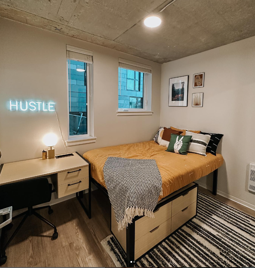 From the contemporary architecture to the chic, minimalist, and thoughtfully furnished units, every detail in HERE Seattle is tailored to resonate with the modern youth. There are private 1B units and shared 2B, 4B, and 5B rooms in HERE Seattle Apartments. The rent encompasses Internet, water, trash, cable, and sewer bills. Each unit is fully furnished and move-in ready, featuring a full-size bed, a desk, chairs, a wardrobe, a washer, a dryer, a microwave, and an oven. The public amenities in The HERE Seattle include a gym, a sauna room, a spa room, an outdoor grilling area, a courier room, a package room and a quiet study room equipped with single study spaces and desktop computers. In addition, security is a top priority in HERE Seattle Student Apartments, with 24-hour surveillance and a coded front door entry system.