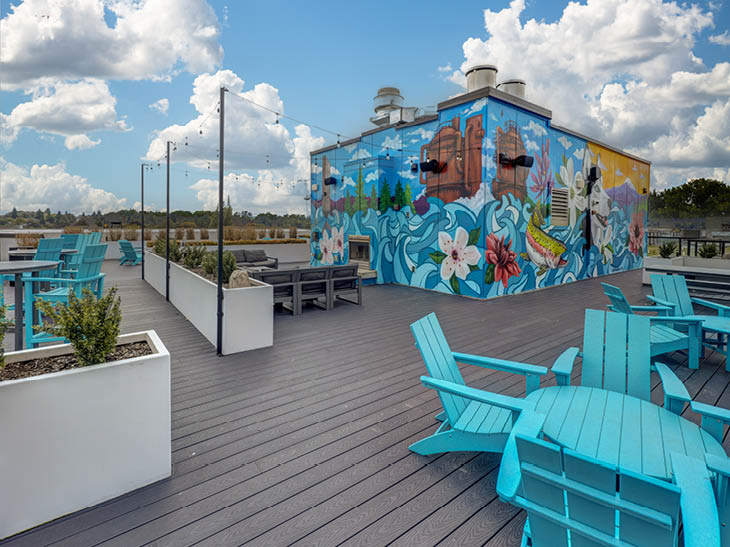 Outdoor & Rooftop: Oversized hot tub with sun deck; outdoor kitchen with BBQ stations; gaming area with billiards, ping pong and football tables; rooftop lounge with dining tables, banquettes, and fire pits; outdoor multimedia zone with fireplace, two 55" TVs, and lounge seating.