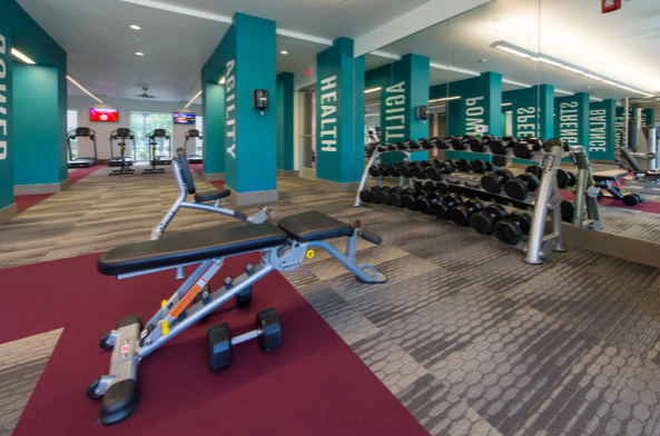 The community amenities at Lark Northgate are a rooftop pool with TVs, grilling stations with a courtyard, a 4000-square-foot fitness center with a yoga and spin room, a business center with printing, private and group study rooms, and a pet park. Lark Northgate College Station also provides garage parking, on-site management, and social events for the residents and friends.