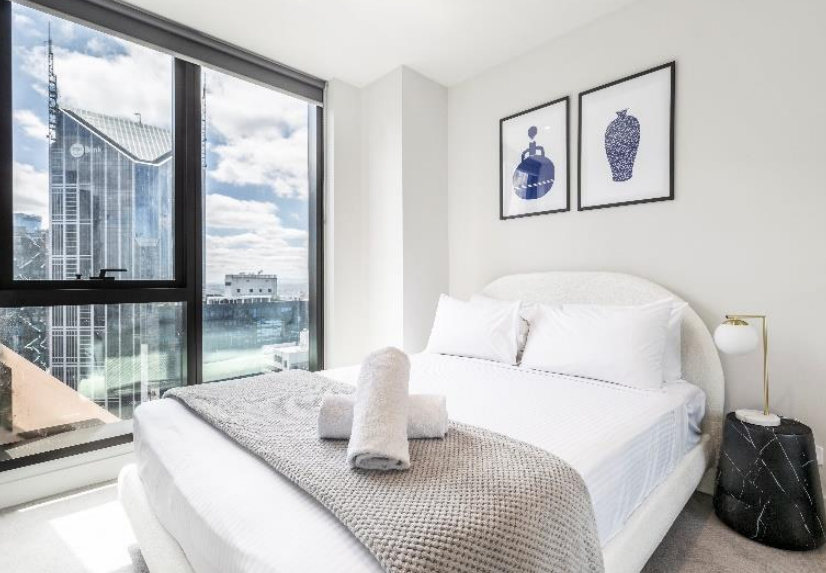 Melbourne CBD Serviced Apartment combines comfort, style and convenience, making it perfect for business travellers and leisure visitors. Offering mainly 2-bedroom flats, each flat is furnished with contemporary decor and has a fully equipped kitchen with the latest appliances, such as a dishwasher and microwave, ensuring guests can enjoy home-cooked meals easily. The living rooms are spacious and bright, with comfortable seating and flat-screen TVs, sofas, dining tables, wardrobes and more. In terms of infrastructure, the entire building is equipped with high-speed internet connectivity and air conditioning. Communal facilities include an Elevator, Gym, and Swimming pool. Outdoor amenities enrich the living experience here, and the private balcony with stunning views of the Melbourne skyline is the perfect place to unwind in the evening. Security is paramount at the flats, with 24-hour surveillance and secure keycard access to the building, lifts and individual flats, ensuring peace of mind for all guests.
