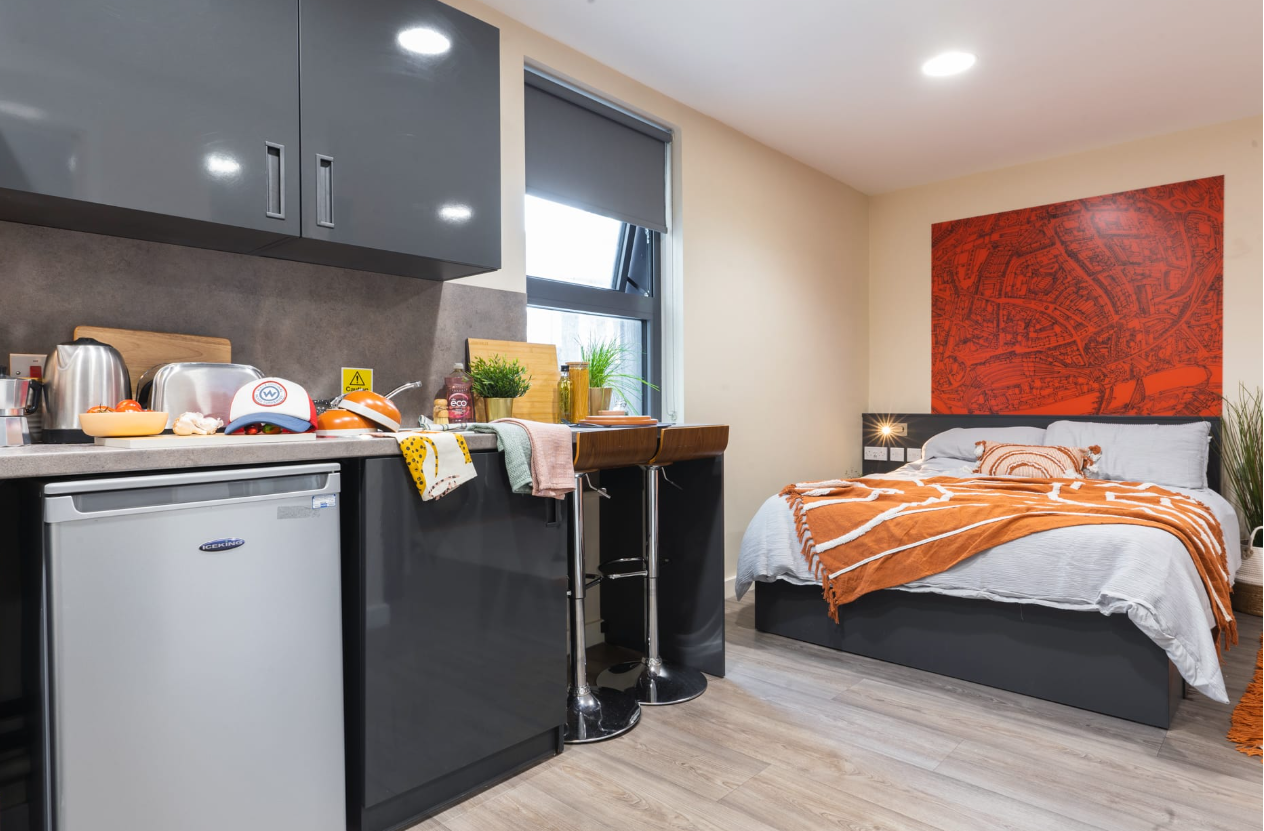 At Oxford House, we understand that every student is unique. That's why we offer a range of room types to suit your individual preferences. Our 5B/6B/8B En-suites are perfect for those looking to mingle and connect with like-minded students, providing a sense of community, while private en-suites and shared kitchen/lounge areas ensure comfort and convenience. For those who prefer an independent living experience, our spacious studios among Classic, Premium and Deluxe types are designed with your needs in mind. Students living in the Newcastle accommodation at Oxford House are free to enjoy the double bed, chairs, desks, full kitchenettes with ovens, microwaves and freezers, as well as wheelchairs accessible for students with special needs.
