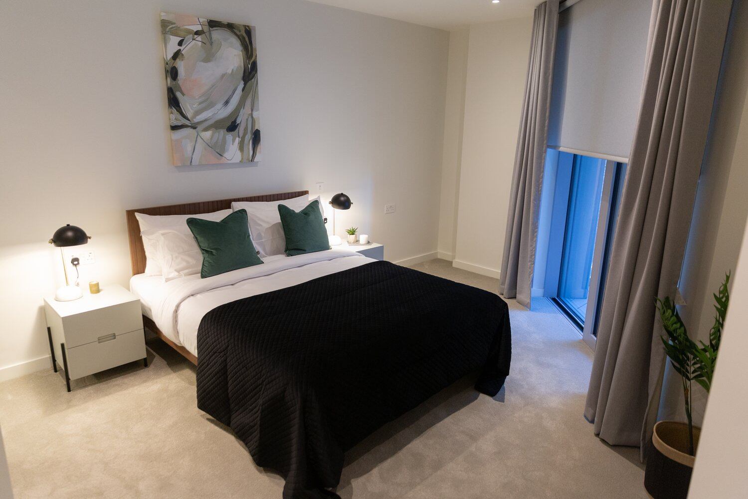 The bedroom is equally spacious and features a comfortable double bed, fitted wardrobes with ample storage space, and stylish bedside tables. The room is elegantly furnished with high-quality linens and curtains, adding a touch of luxury to the space and also features large windows, allowing natural light to flow in and creating a bright and airy ambiance. Students can rejuvenate in their private bathroom, which features a rainfall shower and heated towel rails.