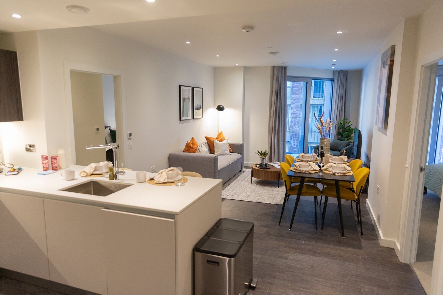 This stunning 1 bed student apartment features a spacious and modern living room with ample natural light and contemporary furnishings. The living room boasts an open plan layout, seamlessly connecting the kitchen, dining and lounge areas. The kitchen is fully equipped with modern Smeg appliances, including a hob, oven, microwave, dishwasher, and a fridge/freezer and the dining area features a stylish dining table and chairs - perfect for hosting, eating or studying. The lounge area has been designed with a neutral colour scheme, accented by pops of colour, creating a warm and welcoming atmosphere and provides a comfortable sofa, armchair and a HDTV which can be enjoyed on cosy nights in. For a moment of peace, simply walk a few metres and open the doors to your own private, outdoor terrace where you can watch the world go by or simply enjoy the views from the floor to ceiling windows.