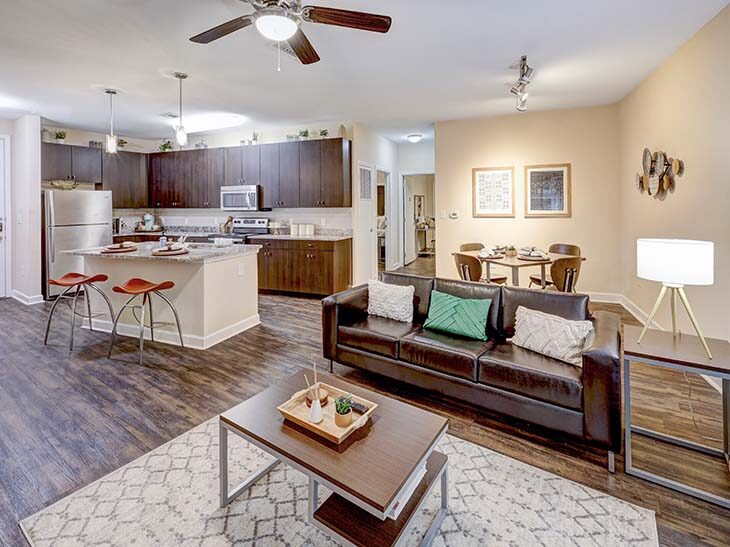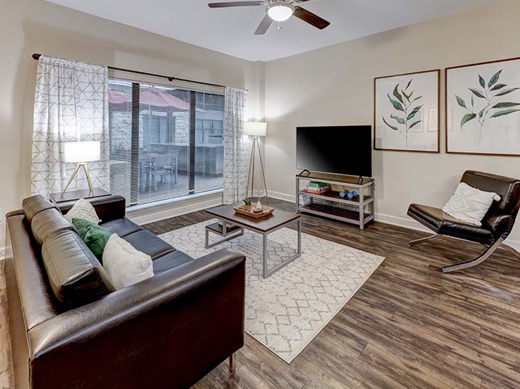 Crest at Pearl's move-in-ready floor plans ensure a seamless transition to university life, providing a stylish retreat you can call home from day one. Hardwood-style flooring and leather-style furniture make up a cosy, exquisite room. The kitchen is fully equipped with granite countertops and stainless steel appliances, making it easy to cook delicious food. Crest at Pearl Austin offers a modern bathroom equipped with quartz stone countertops. Each unit includes a private balcony and a full-size washer and dryer to elevate your daily routine. As a pet-friendly student apartment, it allows you to enjoy a comfortable room with your pet.