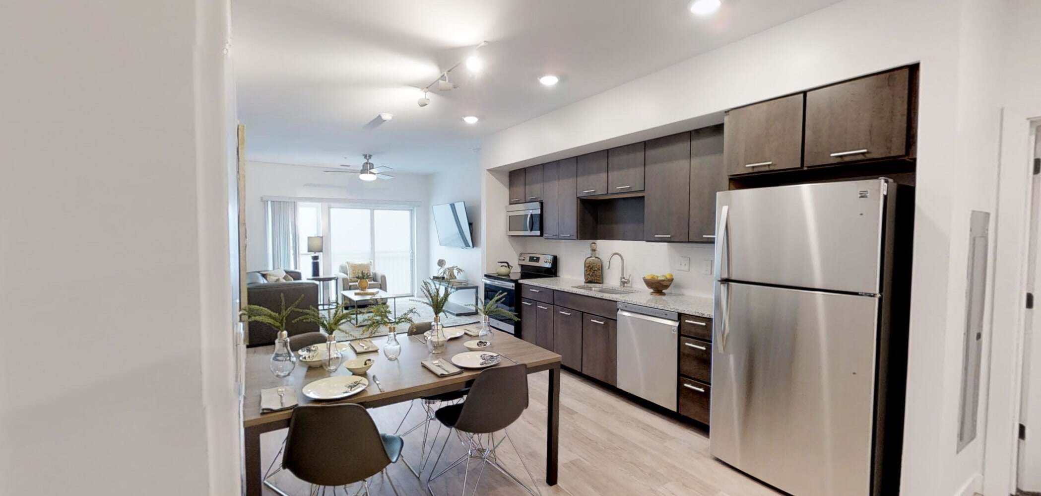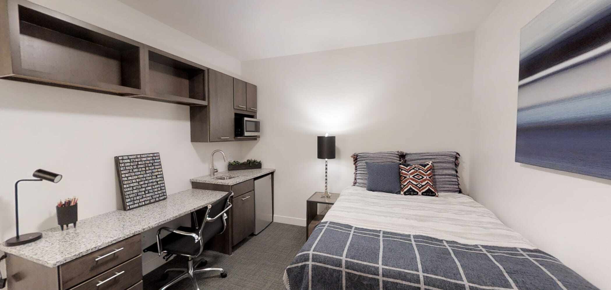 Designed with your lifestyle in mind, the View on Pavey Square apartments feature basic amenities. Each apartment has its own modern kitchen with stainless steel appliances, a mini-fridge for storing your drinks and snacks, and a microwave for quick, easy meals. A whirlpool washer and dryer to keep your clothes clean, modern bathrooms with showerheads, the bedroom has a spacious closet and a Flat Panel LED TV, completing your living space.